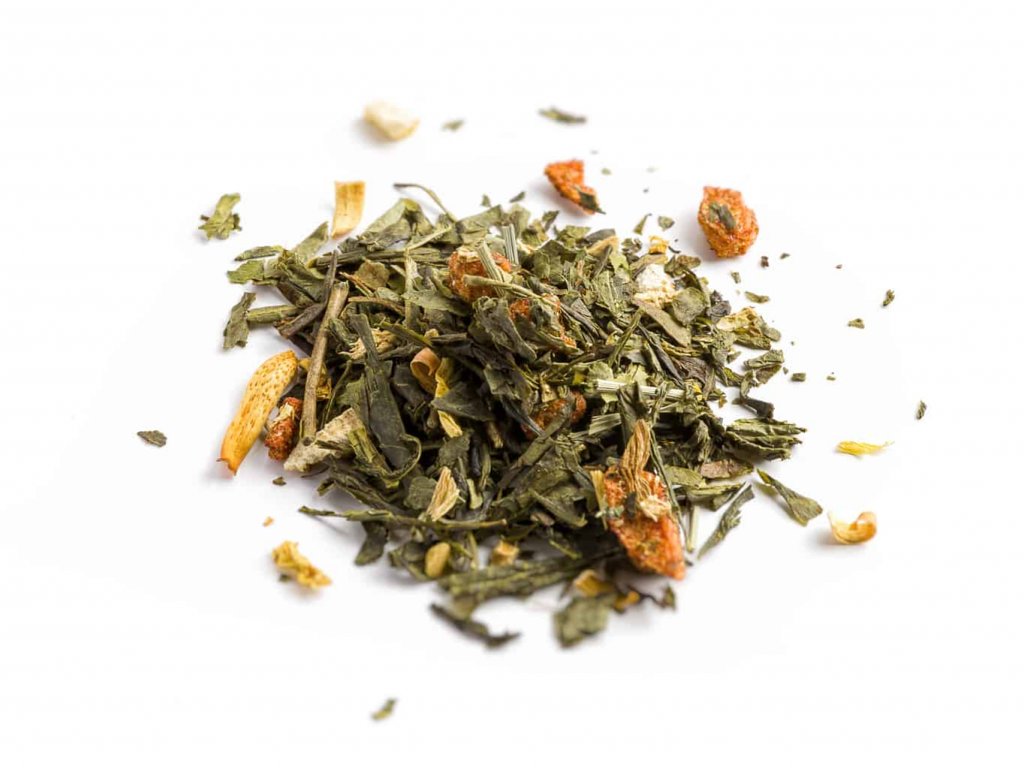 Zloženie: Zelený čaj (76 %), zázvor (6 %), kúsky pomaranča (4 %), citrónová kôra,